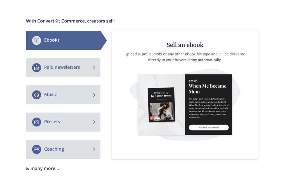 - E-commerce – the ability to sell digital products – you can literally sell your digital products with ConvertKit! Forget Teachable… this is the way to go!