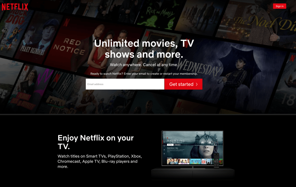 The Netflix homepage is the perfect example of a great landing page. It’s asking you to do one thing and one thing only. Plu, the copy on the page is short and descriptive. Giving you little soundbites or snippets of info that are easily digestable and memorable.