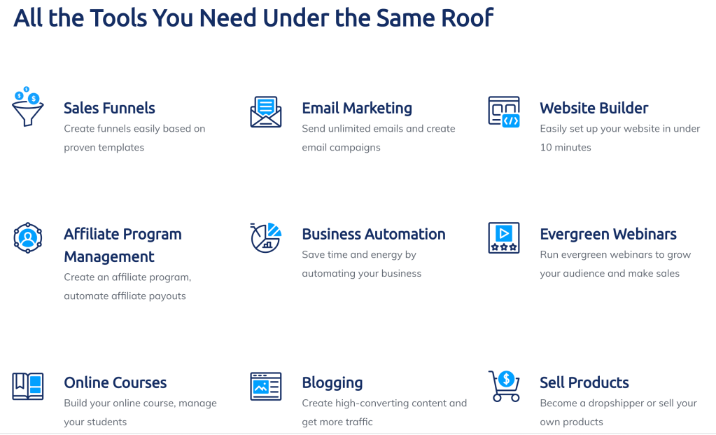 It is a powerful marketing automation and e-commerce platform that enables you to create and manage your website and digital products, automate your marketing campaigns, capture leads, create and manage your affiliate programs, and track your progress.