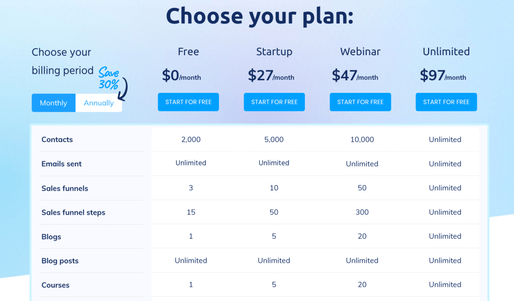 Systeme.io offers a range of pricing options, from a forever free plan (NO credit card required!) right through to an Unlimited plan that is massive! The free plan is plenty to get you well underway in your business! And you can easily upgrade to the next tier, Startup when you need to for just $27 per month. The Startup plan is super impressive and should be all you need!